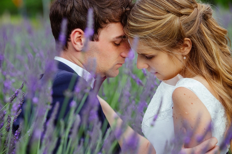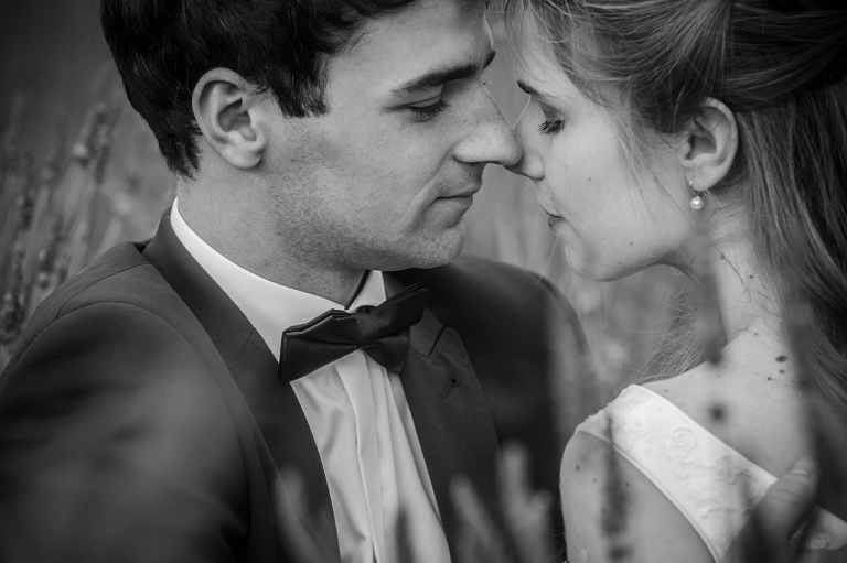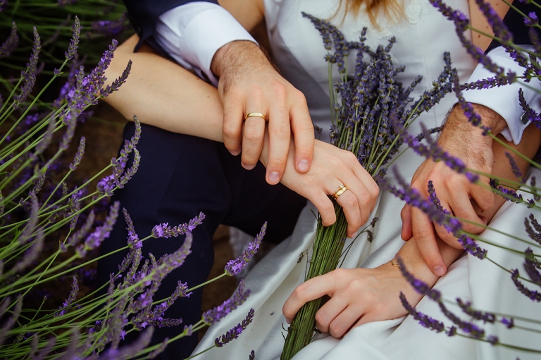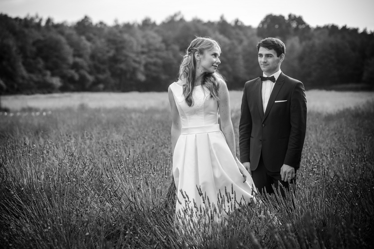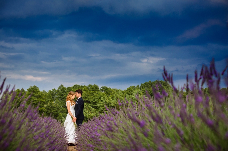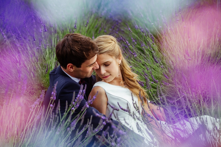 Fioletowe pole lawendy czerwcowym popołudniem. Nad kępkami roślin unoszą się pszczoły. Jaskrawa zieleń pobliskich łąk kontrastuje z granatowym, burzowym niebem. Co rusz zerkamy do góry – będzie padać, czy nie? Pośród lawendowych alejek wysoka, eteryczna blondynka i przystojny brunet. Para jak z obrazka. Ich ciepłe, piękne uśmiechy sprawiają, że można nabawić się zmarszczek mimicznych po drugiej stronie aparatu, bo buzia, od patrzenia na tę zakochaną dwójkę, samoistnie się zaciesza. Cudownie jest fotografować pary, które dzielą się tak ogromną dawką miłości. Tak ogromną, że ciemne chmury zniknęły za drzewami, a na koniec zdjęć mogliśmy się cieszyć pięknym słońcem 😉