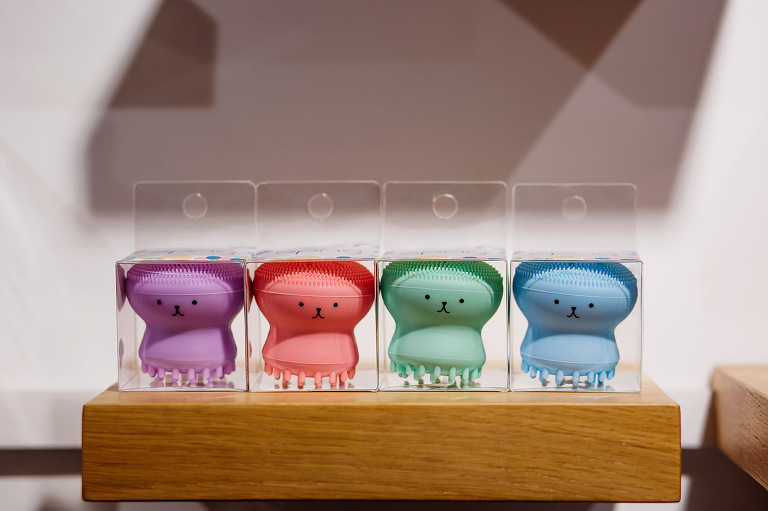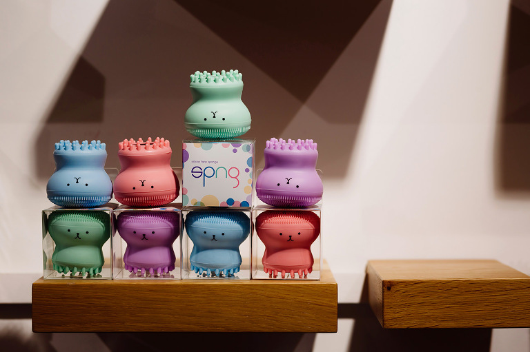 Fotografie produktu w kolorach różowym, niebieskim, zielonym oraz fioletowym ukazują myjki w figlarnych odsłonach.