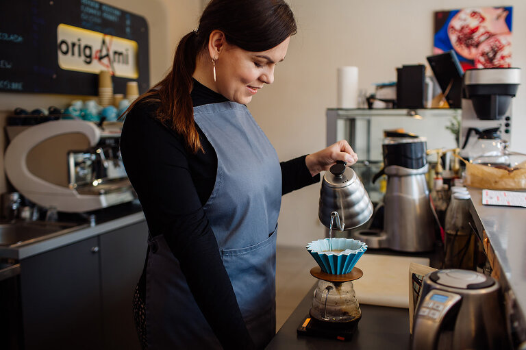 Kawiarnia Origami jest jednym z najlepszych miejsc w Warszawie do wypicia aromatycznej kawy, przygotowywanej przez certyfikowaną baristkę. Fotografia wnętrz tego miejsca była czystą przyjemnością. Poranne, przedwiosenne słońce wpadało do środka, gdzie w powietrzu unosił się zapach różnych rodzajów kaw, herbat, ciast i deserów.